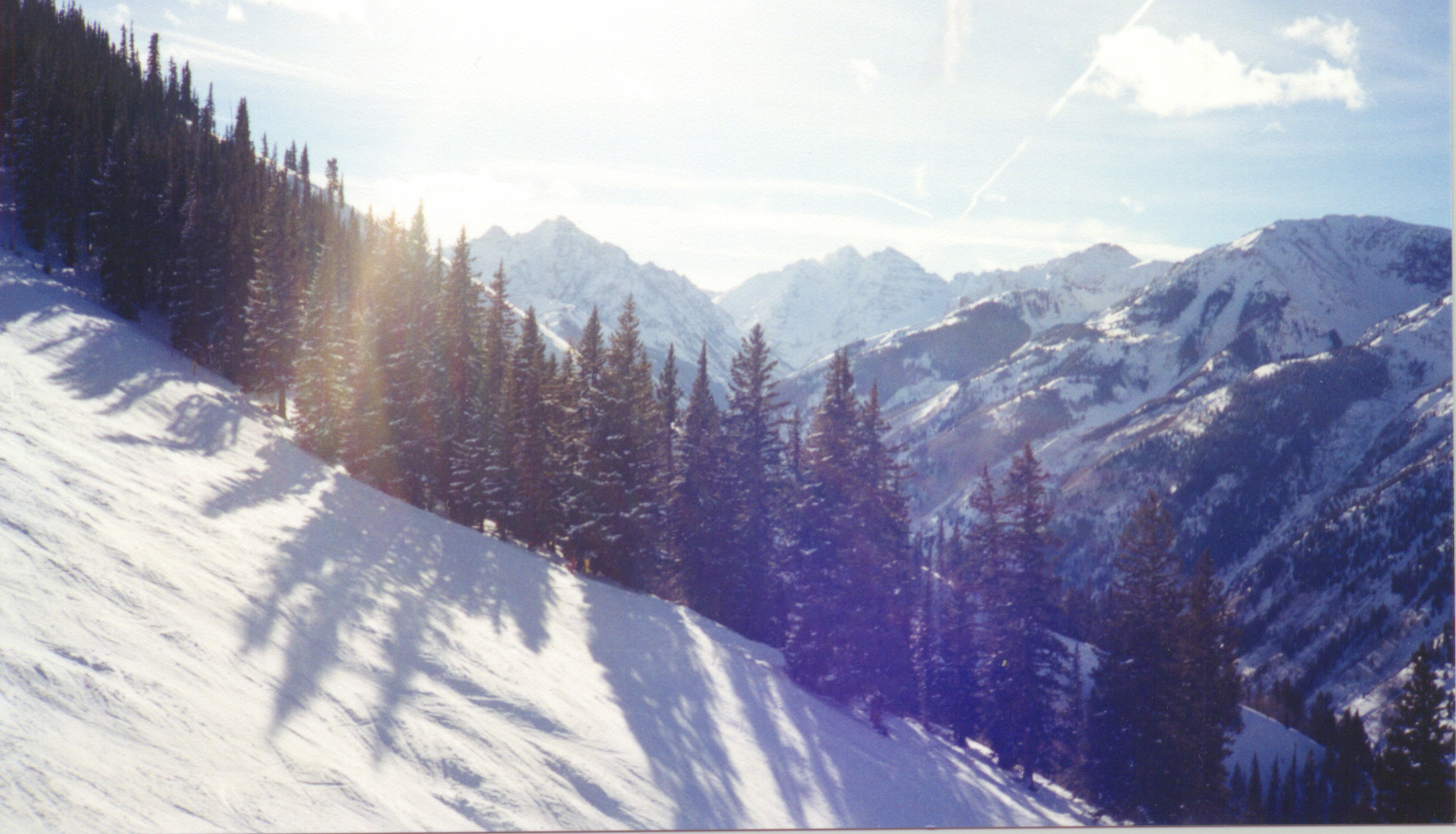 Bathed in sunlight, pine trees project their shadows on snow-covered Highland Mountains. Aspen, Colorado, January, 1999.